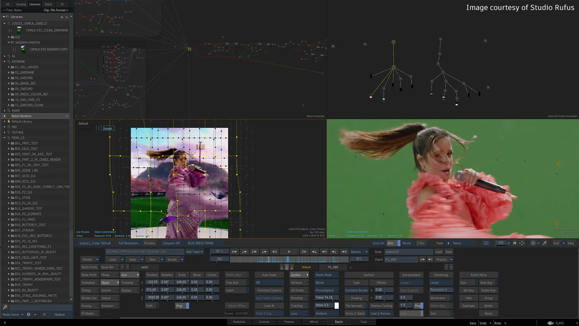 - Batch Effects System: Set up complex visual effects chains using Flame’s Batch node graph.