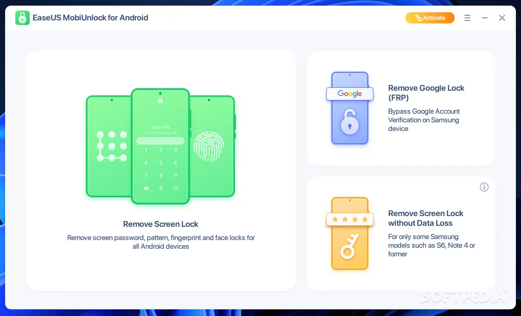 - Remove All Types of Screen Locks: Get rid of all locks that use PINs, passwords, patterns, fingerprints, or faces to quickly get back into your device.