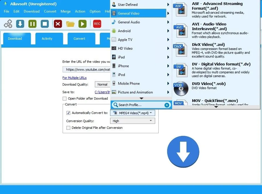 - Multiple Formats and Conversions: Allavsoft lets you download media in its original format and also instantly changes it to the format you want. MP4, AVI, WMV, MOV, WebM, FLV, and other file types can be used to play videos. MP3, WAV, M4A, FLAC, OGG, AIFF, and WMA are all audio files that can be played.