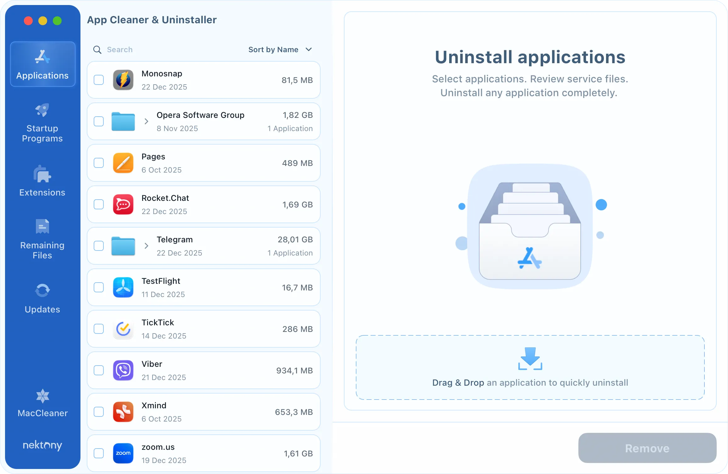 App Cleaner & Uninstaller Key is a sophisticated application management tool made by Nektony that helps you keep your macOS system quick, clean, and well-organised. This tool is for people who wish to have full control over the apps and storage on their system. It makes sure that unwanted programs are completely eliminated without leaving behind any hidden data.